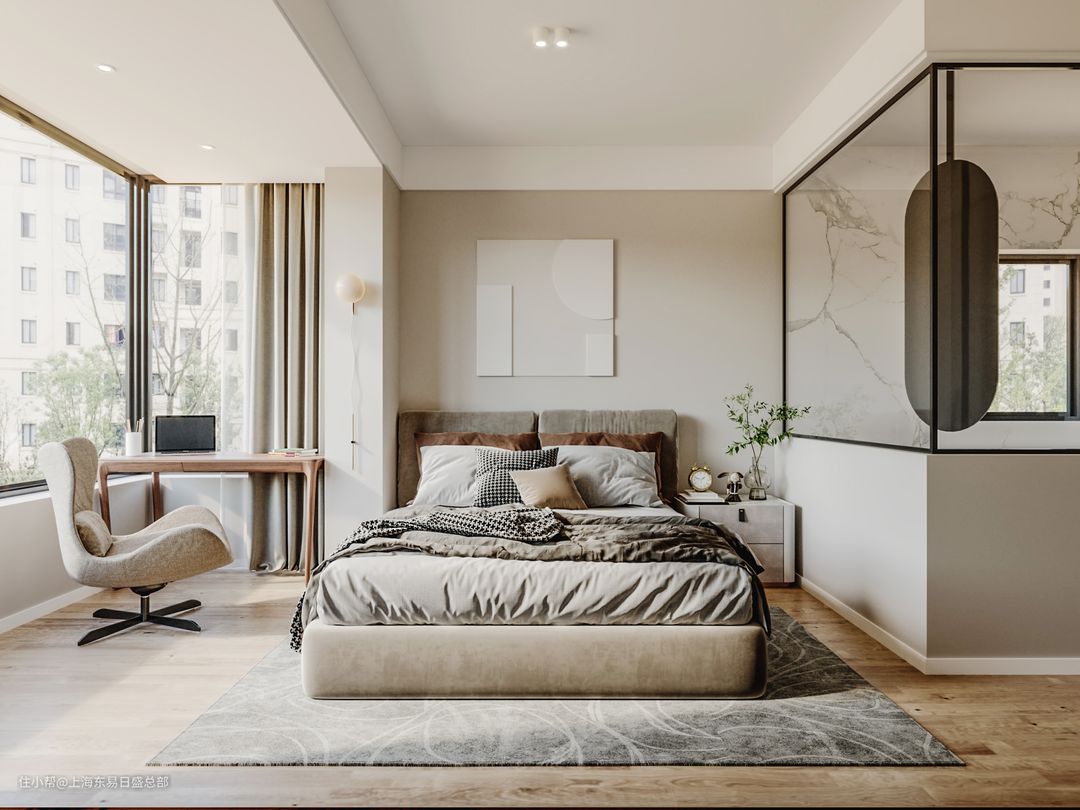 主卧硬装上采用了清浅的灰白色,靠阳台空间做了小书桌,女主人可以舒服的窝在椅子上追剧,此偶尔需要在家办公时也非常方便。主卧卫生间使用玻璃隔断设计,保证了使用功能的需求,同时也让空间足够通透敞亮。