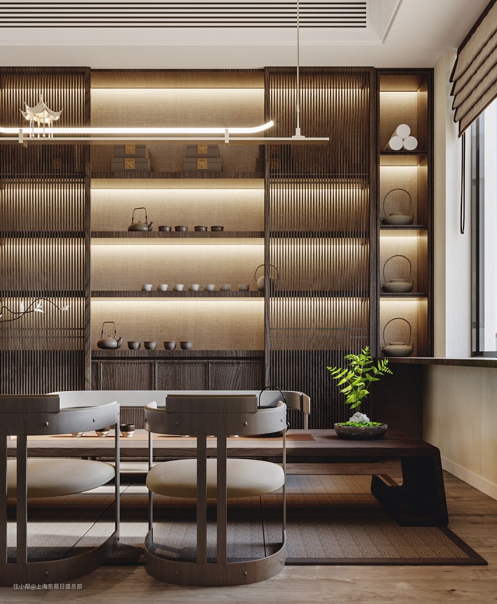 一楼添加半高墙来划分茶室区域,极大地保证了采光,让整个空间更加开阔敞亮,同时也保证更加舒适流畅的空间动线。茶室整体风格更偏向禅意的中式设计,通过质朴的原木以及方正的桌椅造型,打造静谧雅致的休闲空间。