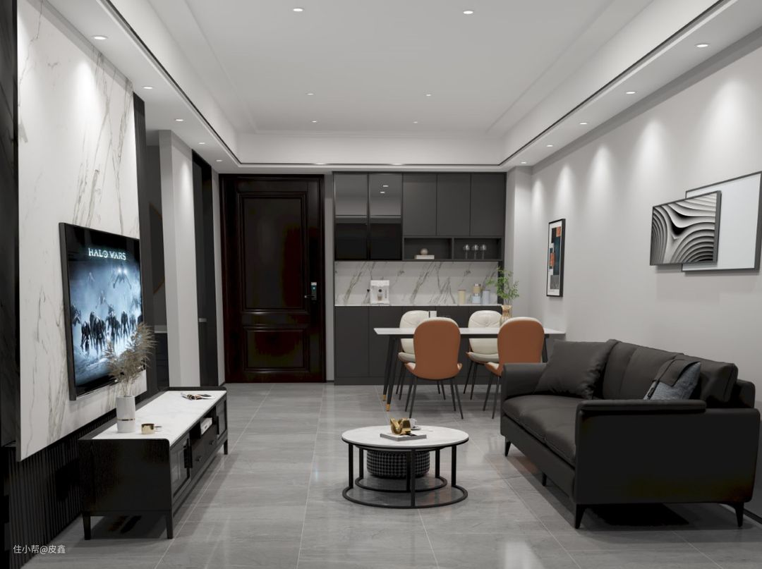 先看客厅整体,我们家的沙发、茶几、电视柜、餐桌餐椅都是月影家居的。黑色调为主。墙面则是以白色调为主,电视背景墙用的是白色的大理石,背景墙边框用了黑色,这个黑色部分主要是用来跟沙发、茶几、电视柜、以及门口鞋柜做呼应。黑色面积较少,呼应一点即可。电视柜是白色岩板台面+黑色柜体,与整体氛围相得益彰。