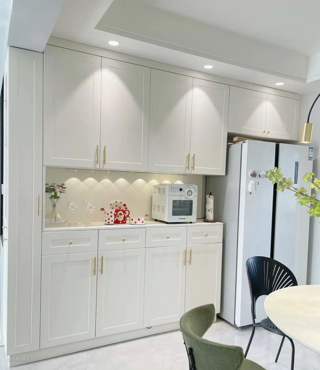 但要注意,木工阶段就量好餐边柜尺寸,做好吊顶,因为门板标准高度2.4米,不做吊顶的话,后期门板加高要额外付钱,且稳定性也不好,时间久了容易变形。