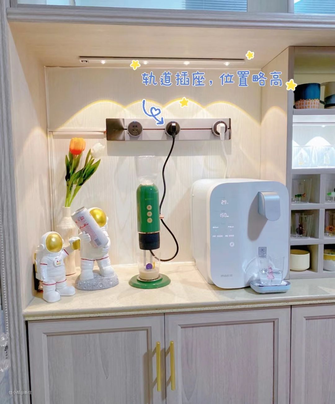 台面放小厨电,电源必不可少,而且要留足够多的,不想一排都是插座的话,现在也有这种轨道插座,可以随意增加插孔,只需留一个电源就行,灵活方便。