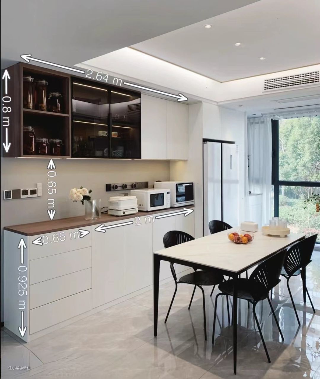 餐边柜中间的位置,都是要设计操作台的,上面主要放小家电,当西厨用,如果高度不合适,用起来就很别扭。