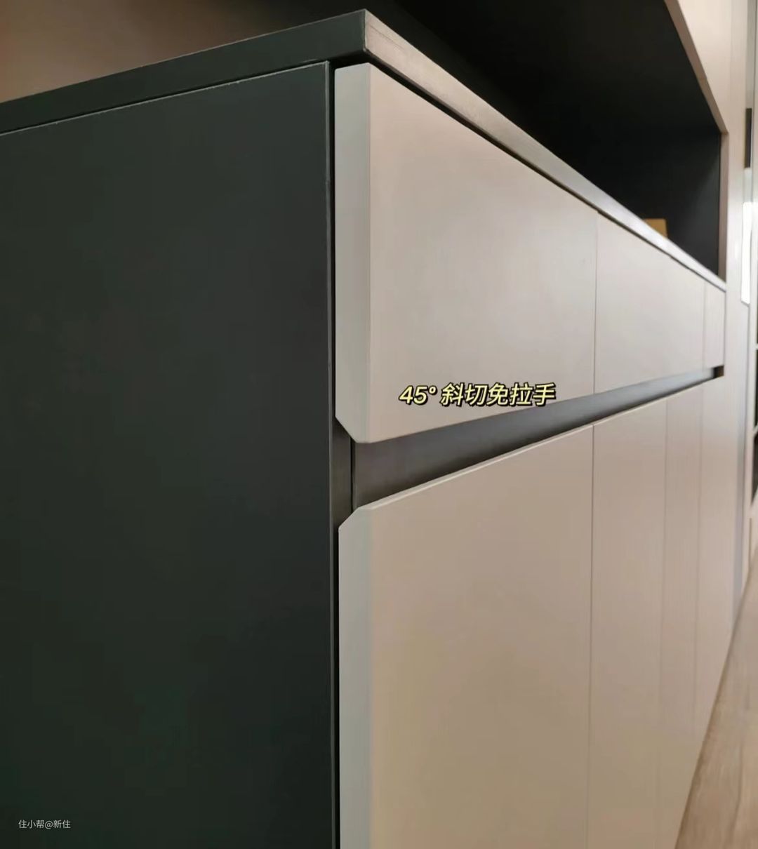 直接做成隐藏斜切边的,简洁大气,也不担心拉手会坏,经久耐用。