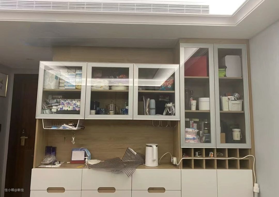 为了好看,很多设计师都会在餐边柜柜门上“下功夫”,做成玻璃的,效果图好看,但实际出来,就是下图这种,里面收拾的再整齐,都显乱。