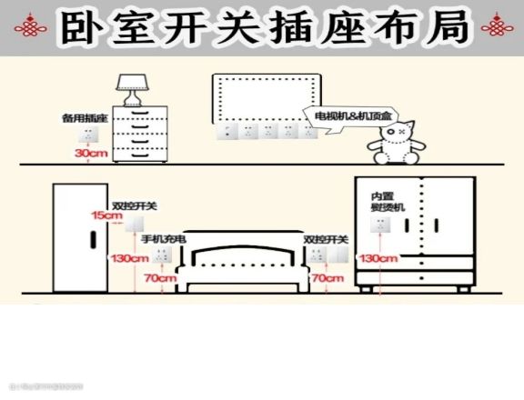 ① 通常的毛坯房只会在卧室的门口处预留一个开关,但是在很多时候我们都会因为各种原因而不愿意下床关灯,所以在床头安装一个双控开关(两个开关可同控一个灯):距地1-1.2米;