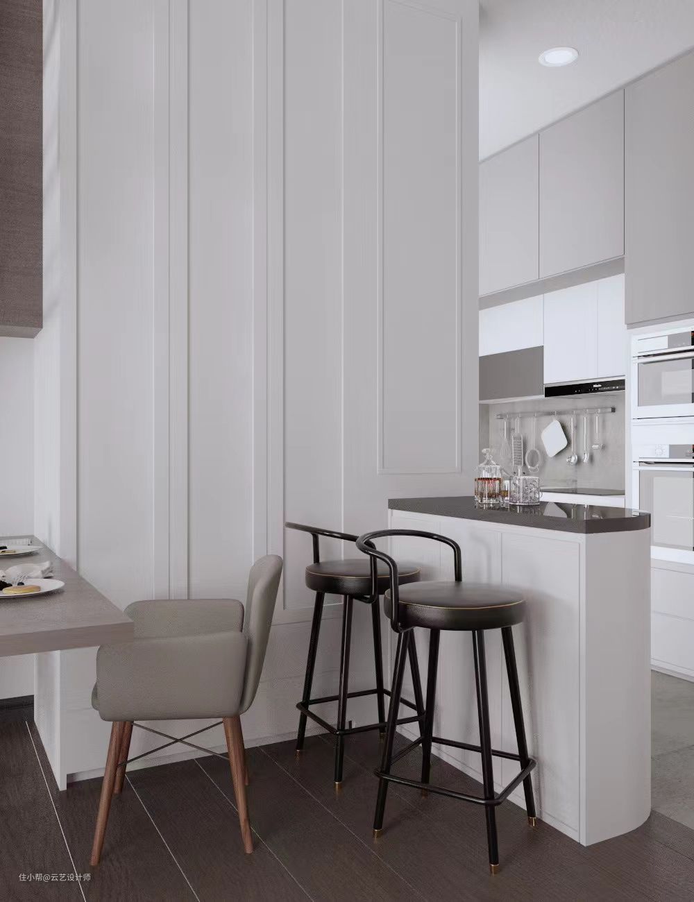 ◈黑色半墙设计契合空间主色调,同时深化了空间的简约质感,。洁白的大理石台面和储物柜,满足了整个厨房的物品收纳空间,极简的黑白灰,高级感十足,黑白灰现代风格与生俱来带着一种艺术范儿,无需绚丽多彩的颜色,就能让人耳目一新,看上一眼,也许便是永恒。