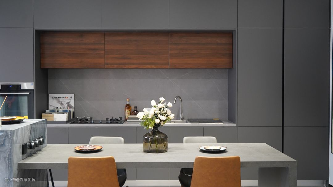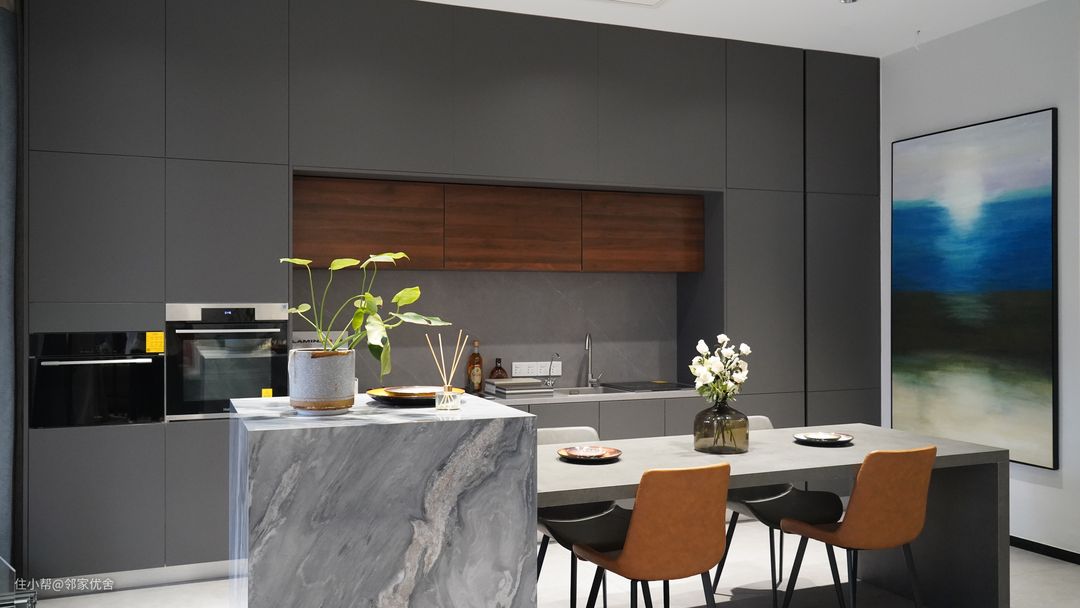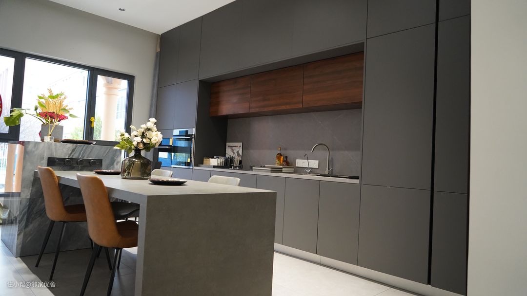 餐厨一体的这种模式,在厨房和餐厅面积都不大的情况下,把餐厅厨房打通,相互借用空间,你会发现,厨房变大了,餐厅也变大了。这也是我们刚说的巧妙利用空间的优点。