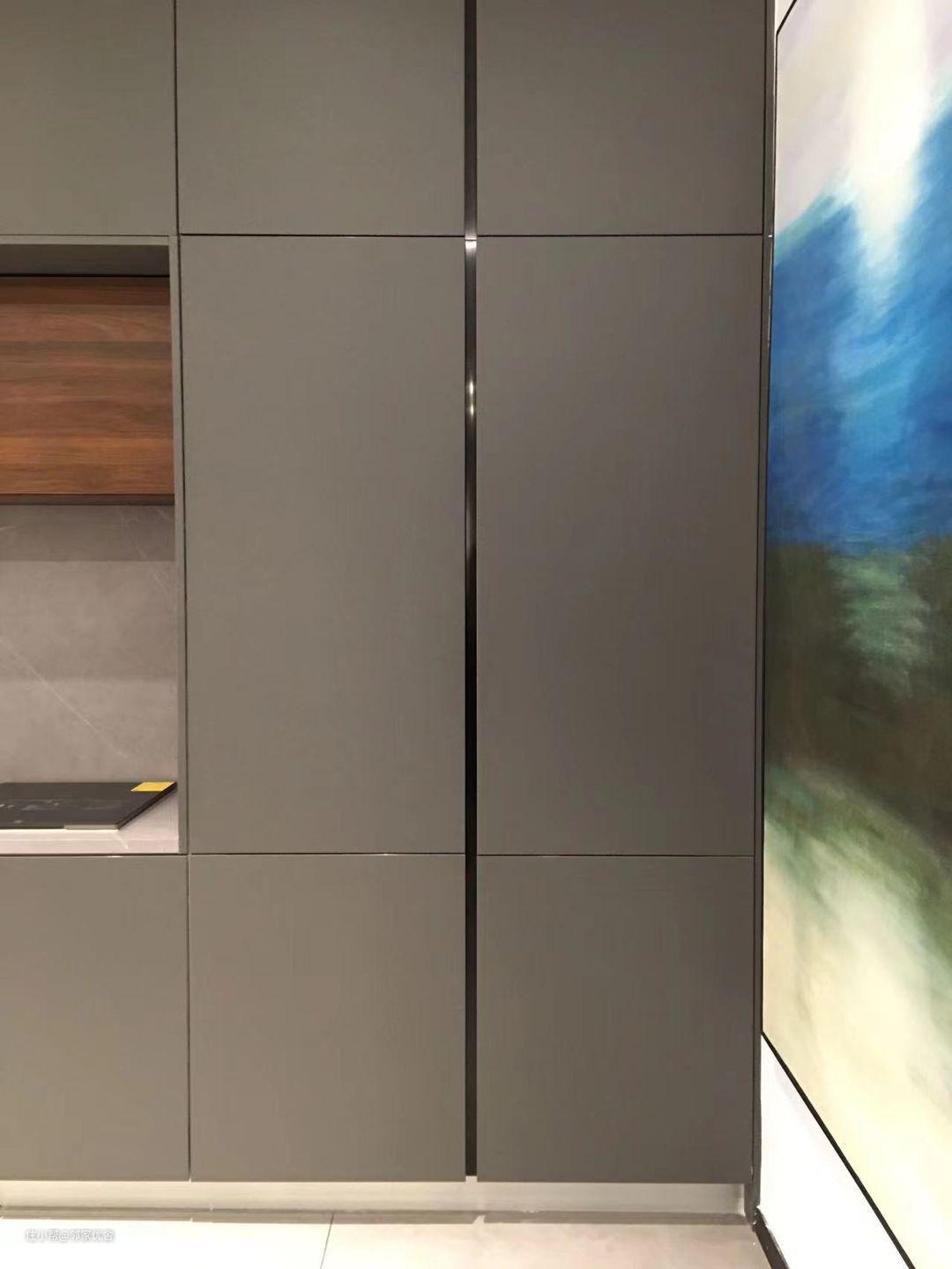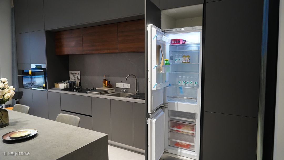 除了蒸烤箱,再看看嵌入式冰箱,冰箱门和整体厨房的柜子材质颜色都是一样的。整体简洁大方,视线更加宽广,空间也不会被分割显得凌乱。