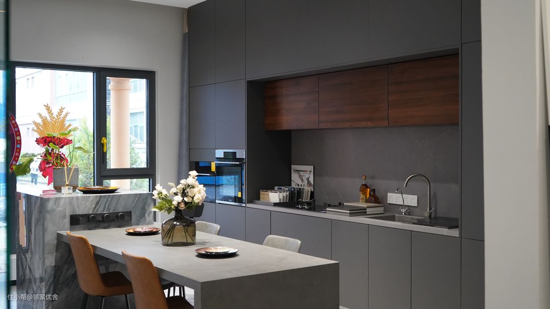 开放式厨房的一大优点就是可以很巧妙地利用空间,是一种厨餐合一,起居合一的设计理念和生活方式,美观实用,这样一个开放式的备餐+烹饪+就餐的空间,让本来枯燥烦累的备餐+就餐环境也变得温馨起来,备餐也能感受到贴心和快乐,时刻是和家人在一起的,也能增加家人的互动感和参与感。