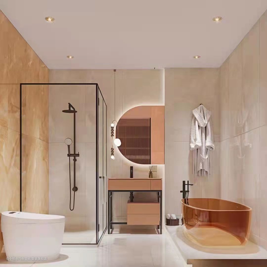 干湿分离的卫生间,这位业主和设计师的思想很独特,洗手台设计在最里面,小编能想到的好处就是,水不会乱洒在外面的干区啦~透明的钢化玻璃配黑色细边金属边框简约精致,橙色透明的浴缸,给空间带来满满的时尚感。