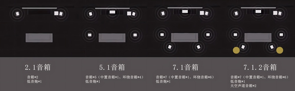 一般影音室的音箱系统配置有:中置音箱、左右音箱、环绕音箱、天空声道音箱、低音炮这些组成,可以还原出立体环绕的声音效果。