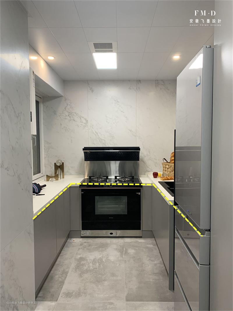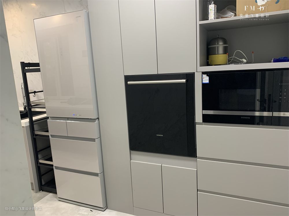 厨房装U型橱柜的,有条件的话也可以在柜尾的任何一侧再装个立柜,不管是作为冰箱柜还是集成柜都是很“香”的!将冰箱、烤箱等各种厨电内嵌在里面,保持空间的整齐统一的同时,也增加了不少收纳。