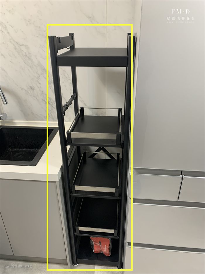 对了,如果橱柜和冰箱之间存在鸡肋空间,也可以在这里装个窄置物架或者是个几十公分的小推车,填补缝隙增加储物空间。