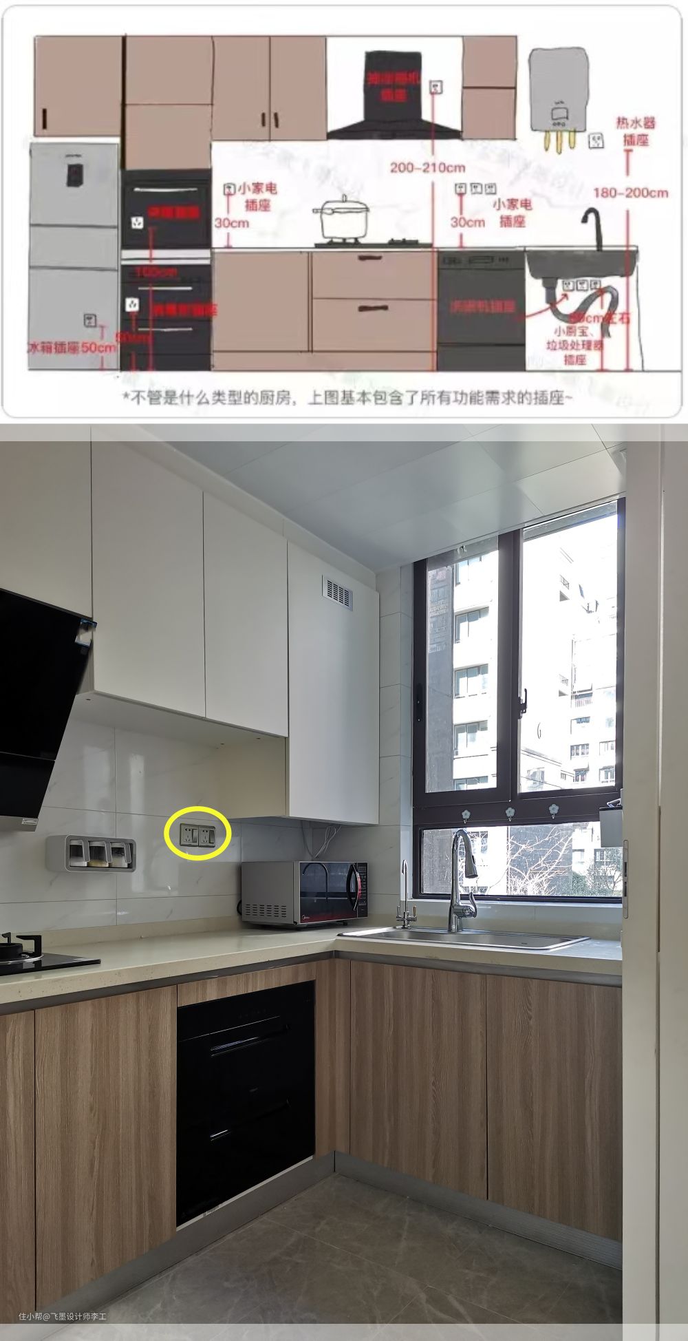 厨房不仅有油烟机、冰箱、电饭煲这些的主家电,后期难免会根据生活的需求添置洗碗机、蒸烤一体机、空气炸锅、咖啡机等的电器,这时候要才想到插座不够,那就是低级错误了。建议留1-2个开关,6-13个插座。