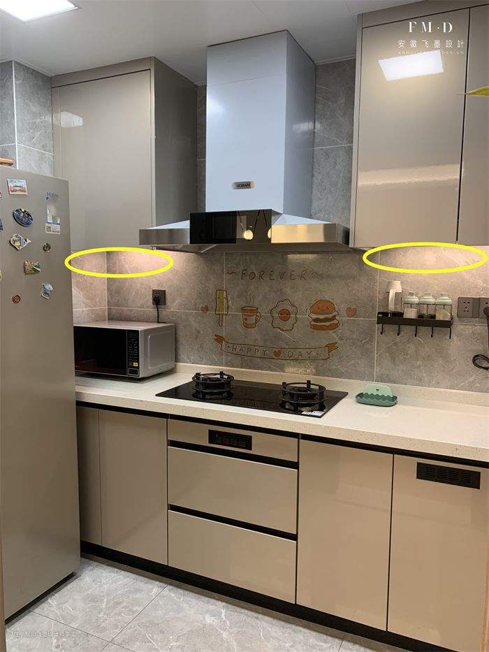 也可以局部提升照明,抛开主灯的设计,可以在吊柜下方装感应灯带,避免操作台面有昏暗死角。