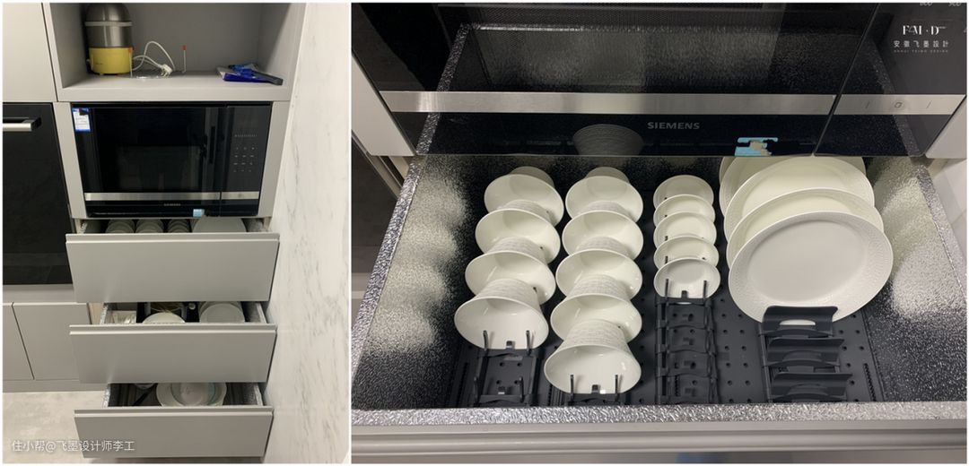 一排顶天立地式的橱柜,上上下下都是储物区,最好是多设计几个抽屉,内部放上收纳神器,抽屉拉出来,放在内部的物品摆放的整齐有序,存取都很方便,看着也顺眼。