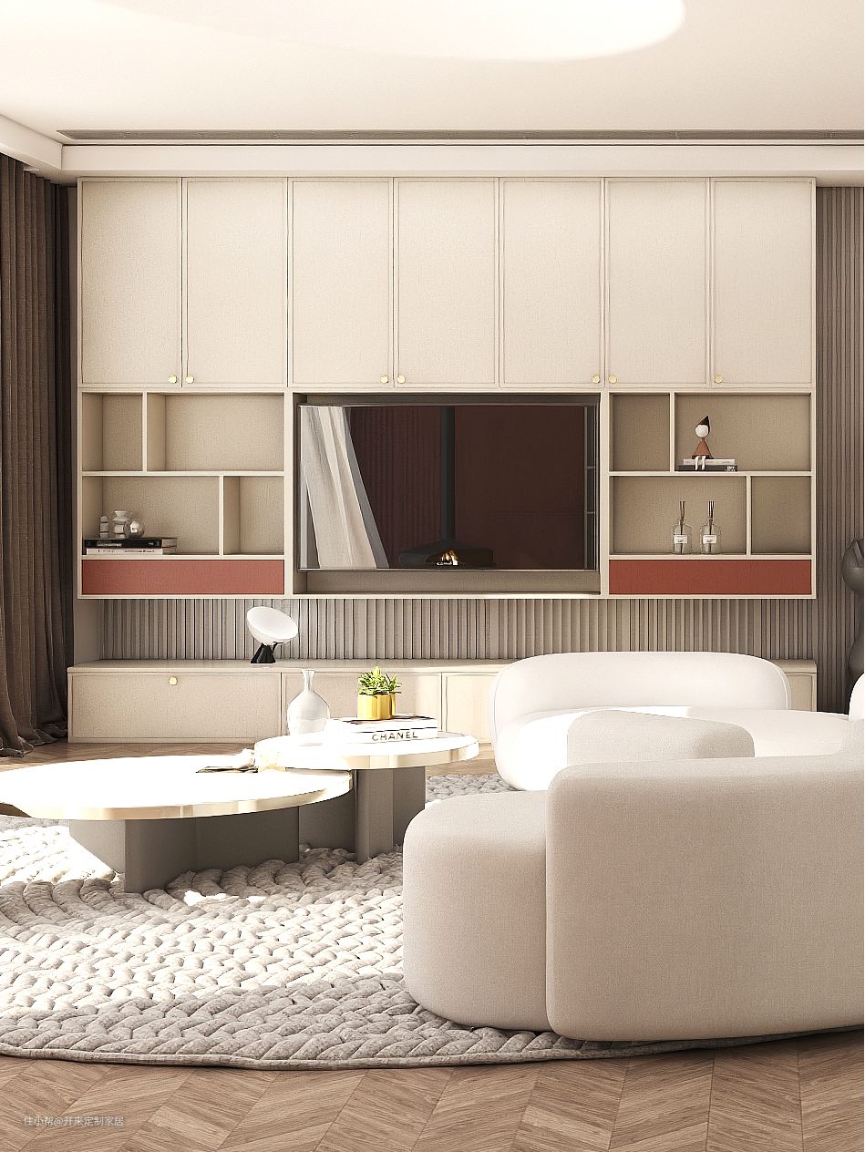 厅柜、餐边柜、橱柜、衣柜、书柜、卫浴柜、衣帽间等空间硬装产品均是全屋定制的范畴,要是家里有人运动或喜欢养宠物还可以专门设计健身房或宠物区;而茶几、沙发等可移动的软装设施不属于全屋定制。