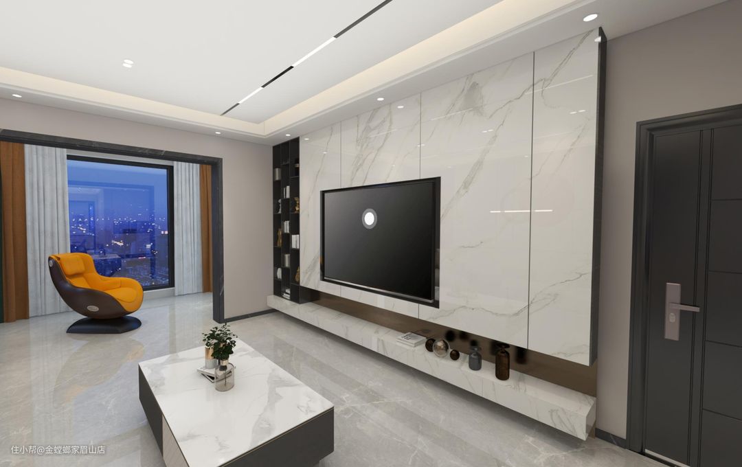 该户型为现代风格,硬装上没有复杂的造型,做了一个乳胶漆分色处理,顶面作无主灯设计。