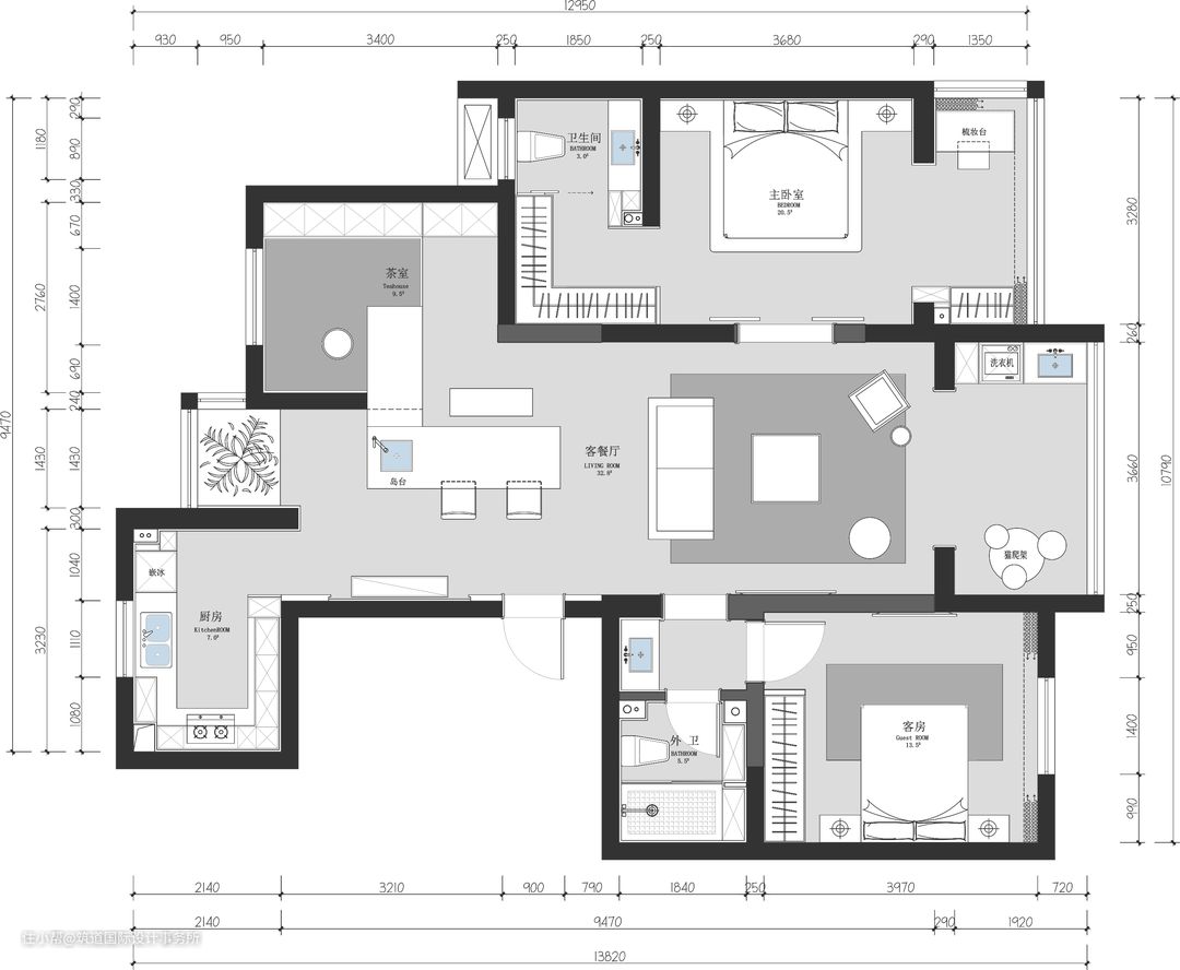 ①打开茶室餐厅客厅,功能相互融合,增加南北采光与空气流动。