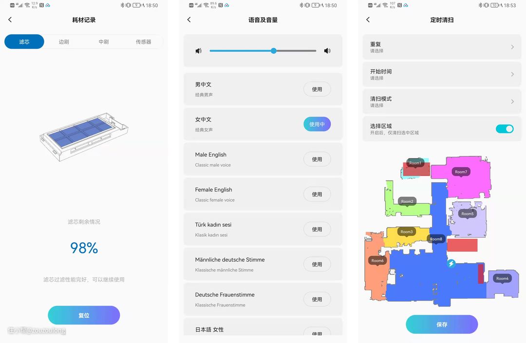 App端耗材的剩余寿命显示非常实用,方便后续及时进行临期更换。清易H40 PLUS支持多种语音,实在是有趣。定时清扫比较适合家居卫生的日常保养护理,相比于每次清扫调用,提前设置好定时清扫无疑是更省事的。