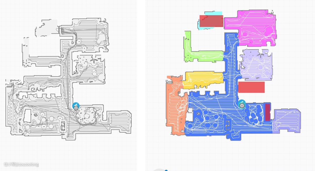 智能规划房间、路线是另一大实用功能。下面是清易H40 PLUS第一次建图时的清扫路径和往后的清扫路径清扫对比,可以看出它不仅建图快、后期还会对地图和清扫路径进行不断优化。