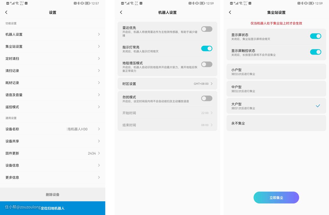清易H40 PLUS的设置内容比较丰富,包含机器人设置、集尘站设置、定时清扫、清扫记录和耗材记录等。而在对应的栏目下,又有丰富的子菜单内容可供设置,比如“雷达优先”、“地毯增压模式”、集尘周期这种实用功能。