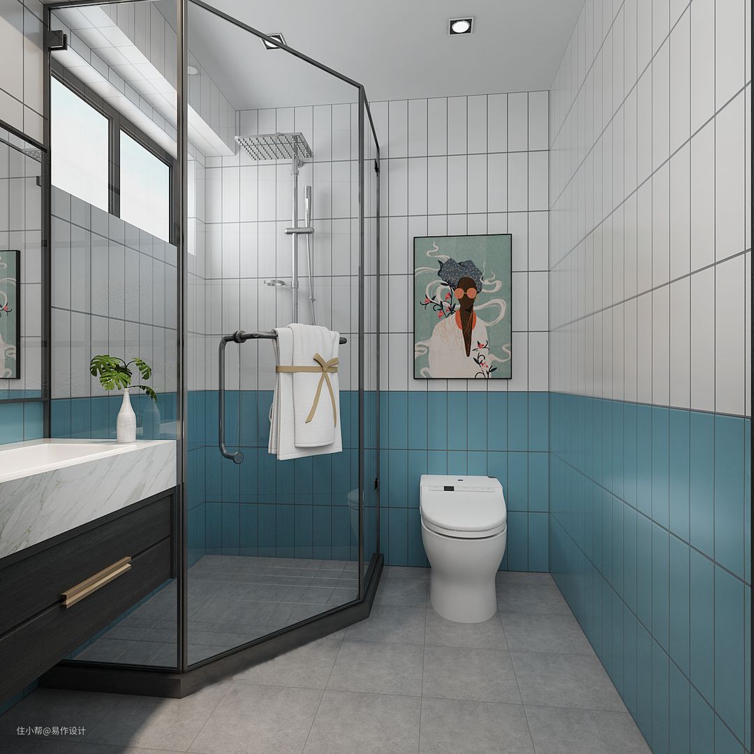 卫生间墙面采用蓝色和白色条形小砖做铺贴,整个空间都显得非常的清爽干净。
