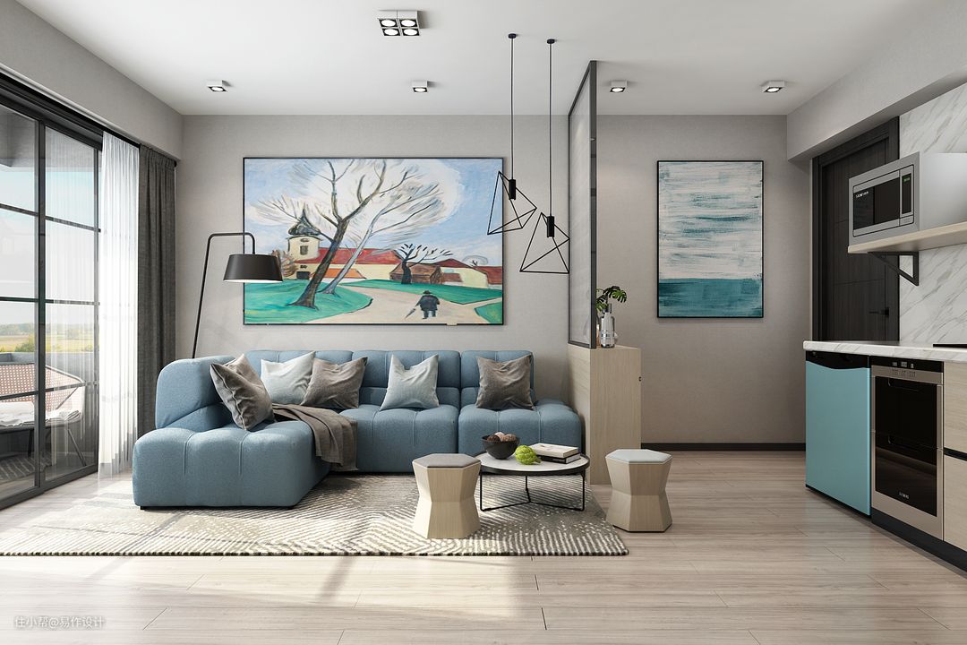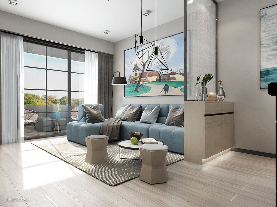 为了避免进门就能看到客厅,在入户和客厅之间设置了一面半开放隔断鞋柜,黑色边框+夹丝玻璃,不会遮挡光线。搭配浅蓝色拐角沙发,空间虽小,却非常温馨。