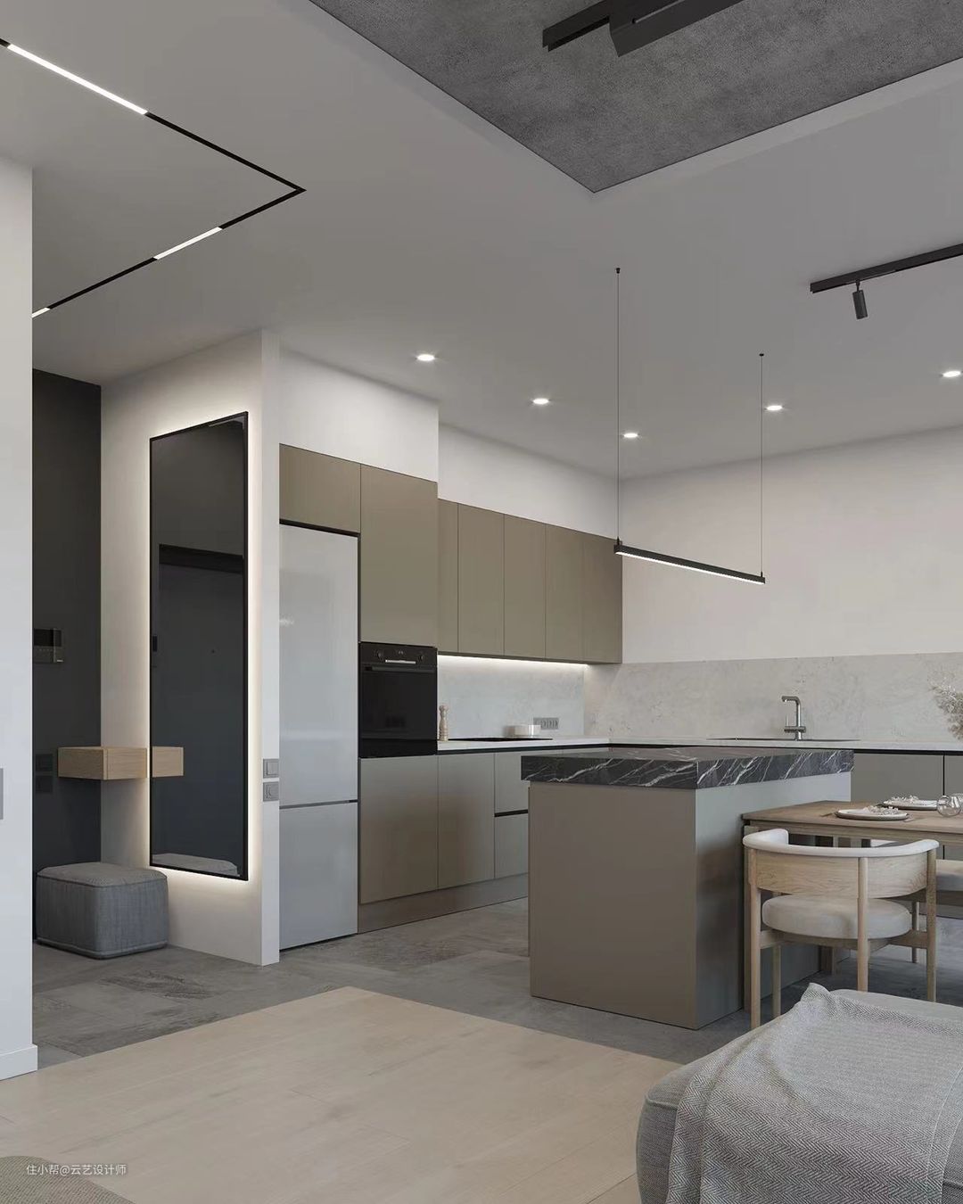 ▶整个客餐厅基调以暖灰为全屋无主灯的设计,浅灰中带有暖咖色的调调,高雅又不会过分隆重,真的是满眼都是高级感。每个细节都彰显品位,做到高级优雅又不过分华俗。