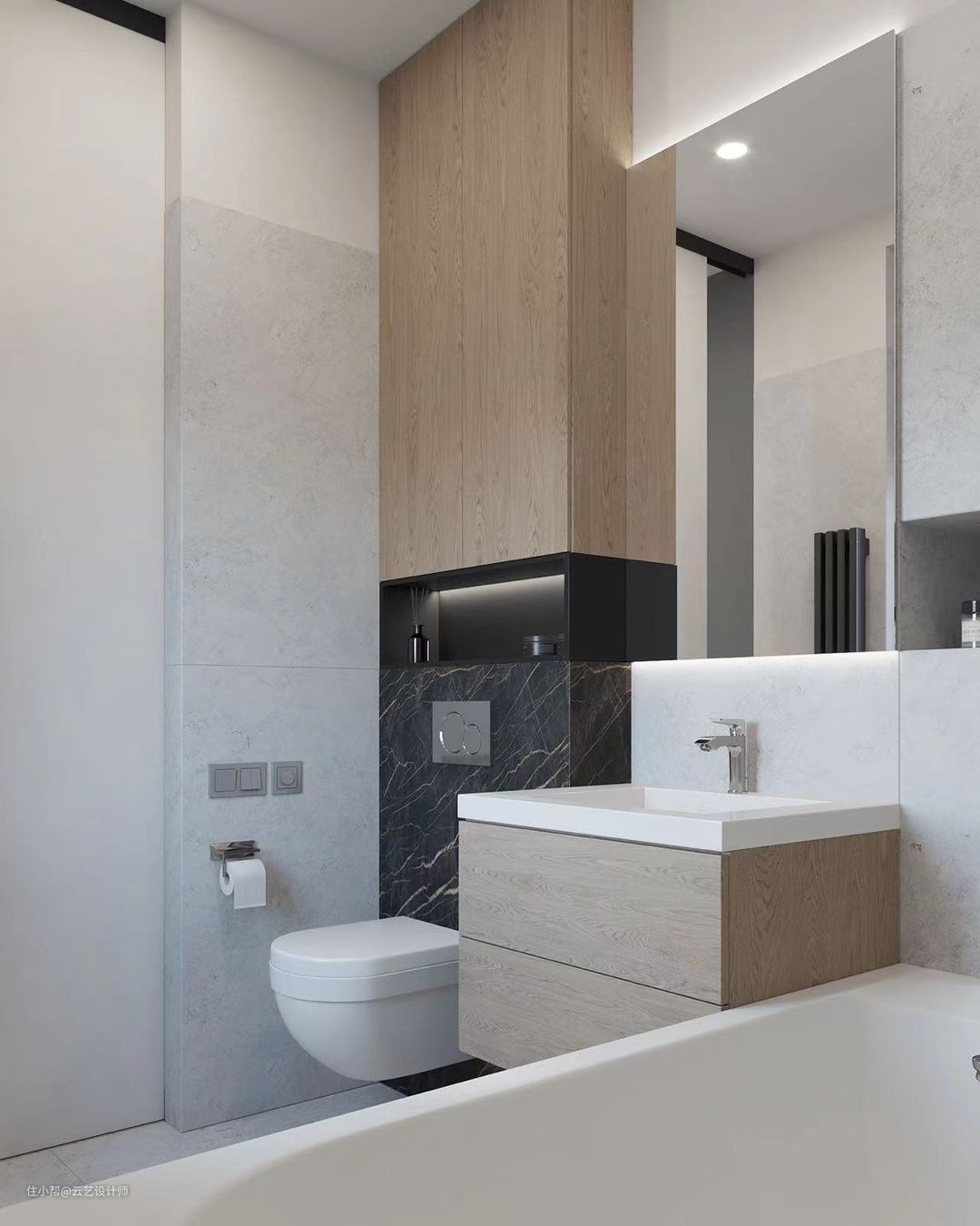▶卫生间整体面积不算大,高级灰的大理石瓷砖在墙面和地面铺贴,就像走进了五星级酒店,油然而生的高端感真的太强烈了。壁龛上方采用木饰面,在木饰面中间穿插了深灰色大理石,材质之间的温度与色调跟整个暖灰色调的空间碰撞,产生多层次的美感,低调,沉稳不繁琐。