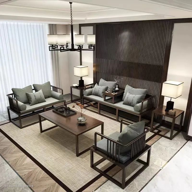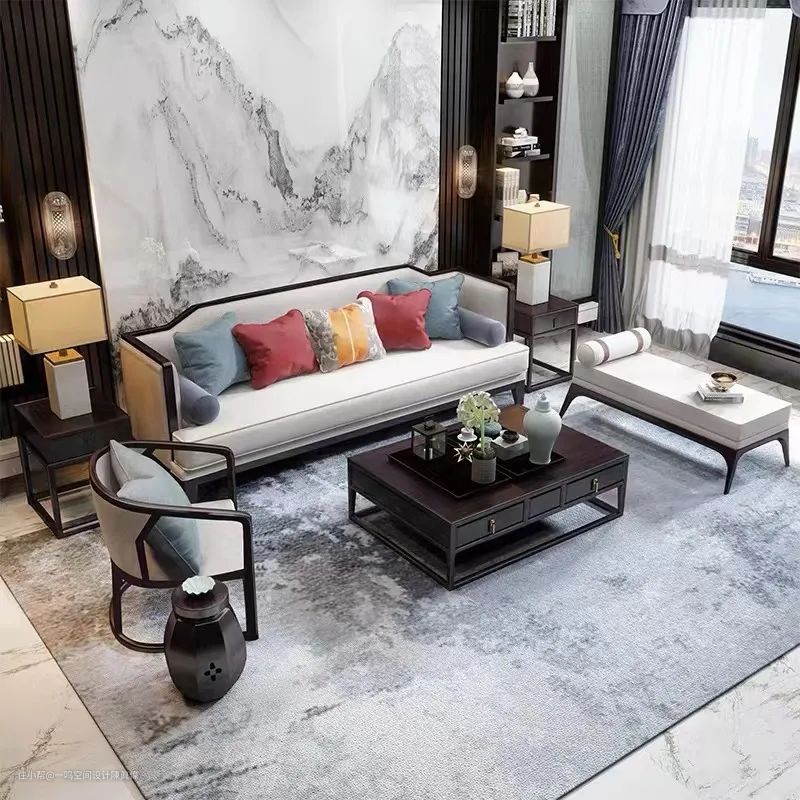新中式风格普遍会将中式风格的元素进行一个简化,加入一些轻奢或者现代的元素。比如说沙发会加入一些金属的元素,传统的云纹或者回字纹路的一个简化版,太师椅的简化版等。