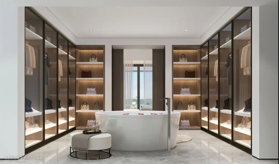 衣帽间到顶设计,灰黑边框+透明玻璃门,在暖光的烘托下,既实用又简约有质感。