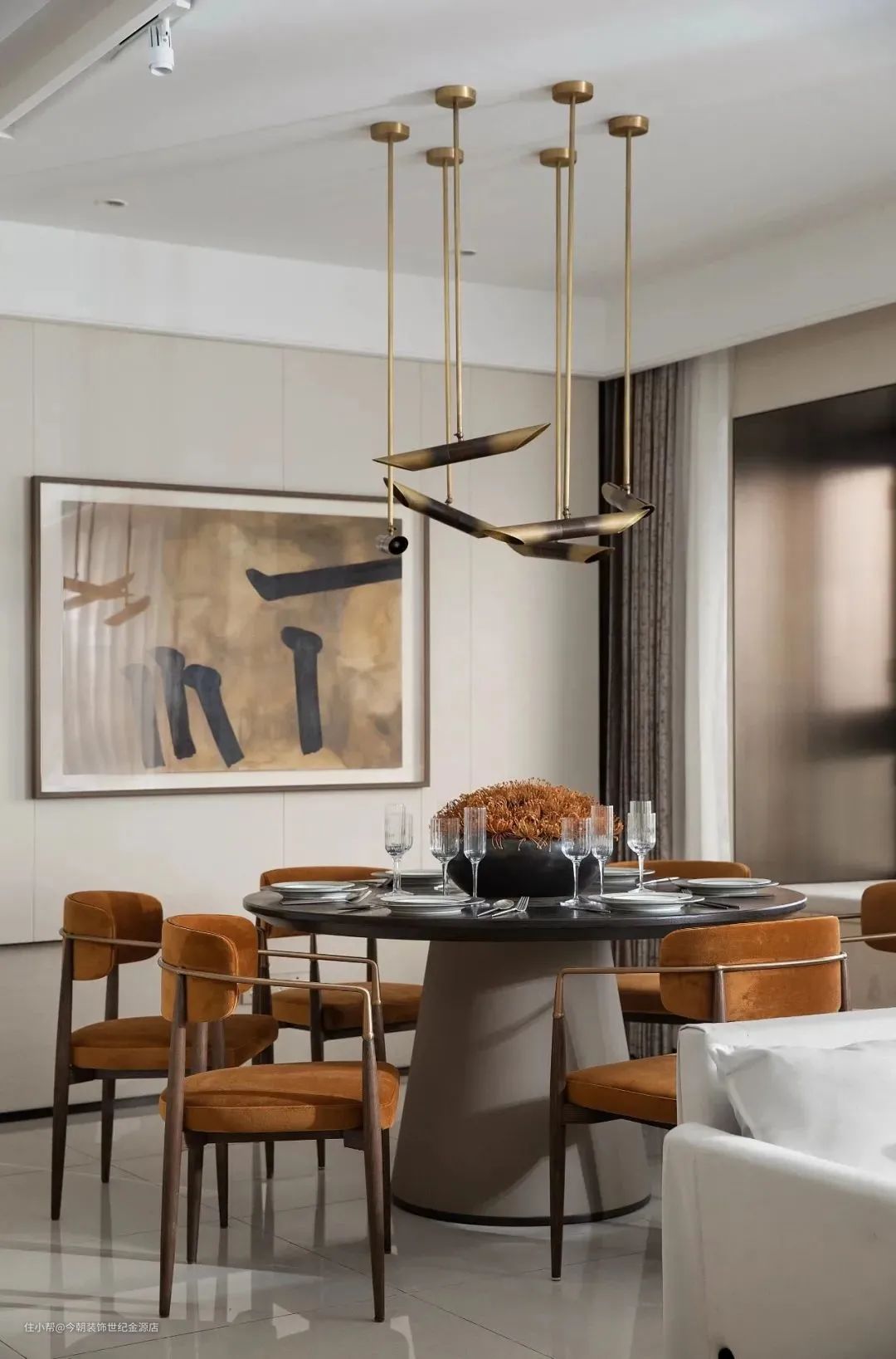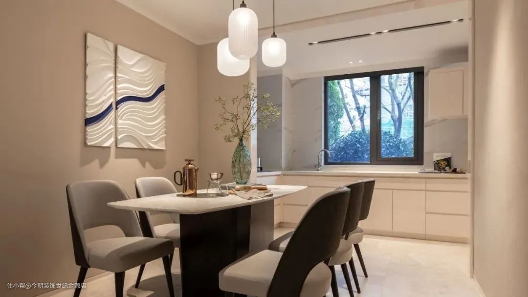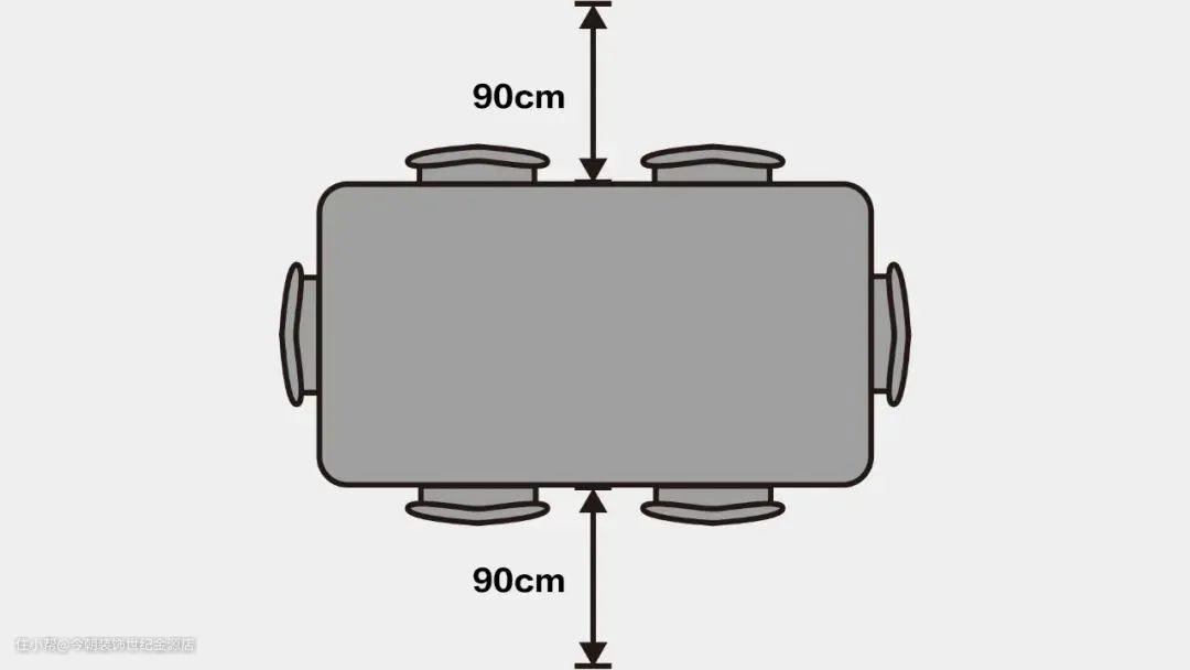 餐桌周围的空间不能太拥挤,不然落座、起身都会受影响。一般建议留出90cm的距离。