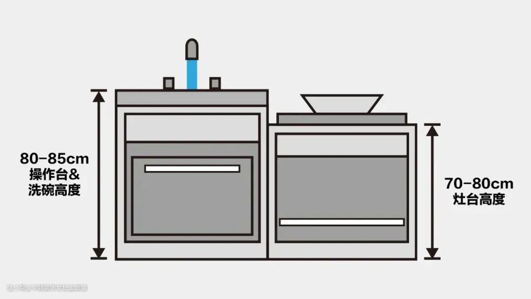 厨房装修中,要注意操作台的尺寸。要按照经常下厨那个人的身高尺寸来做,要不洗个碗腰酸背痛,都是因为高度设置不合理。