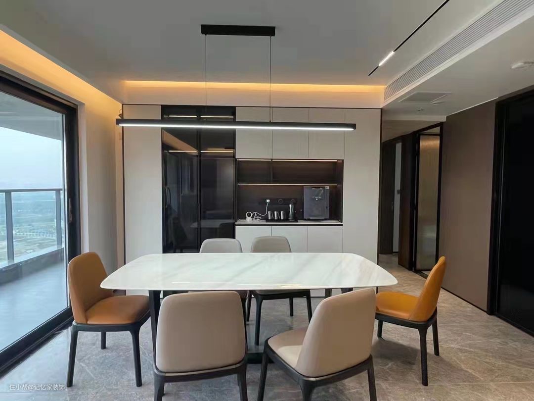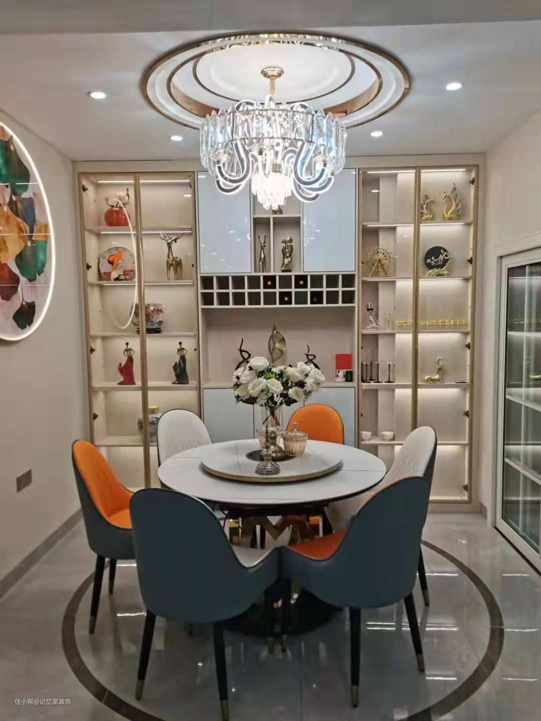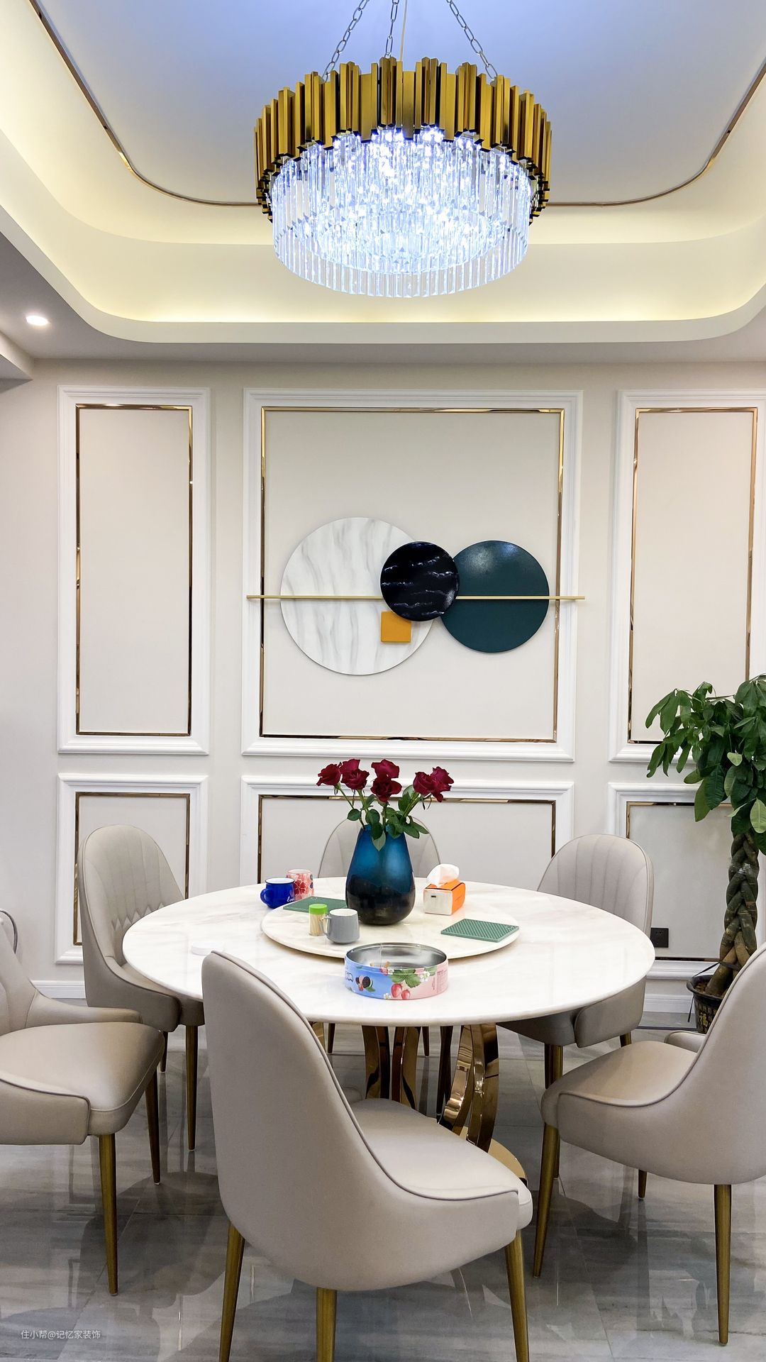 简单的餐厅吊顶就是餐厅四周做吊顶,用金属拉边,灯带隐藏,中间留空,从光线上区分餐厅与客厅的空间。餐厅隐藏灯带增加层次感和氛围感,让餐厅光线更舒适。