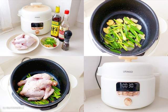 ►电压力锅底部刷一层油,铺上一层生姜片和葱段,放上童子鸡。