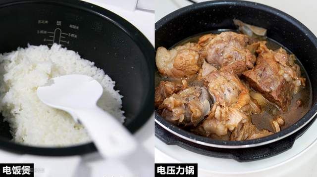 主要区别在于压力值不同,电饭煲是常压,电压力锅是高压,大家看两台机器的盖子厚度就不一样。相比电饭煲,电压力锅的压力值更大一些,把食物做好的速度更快,尤其是一些难炖的蹄筋、大骨棒,会比电饭煲炖的更软烂。