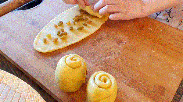 ►面团搓长条,切成8份均匀的小块,每块用擀面杖擀成牛舌状。然后把刚洗好的葡萄干铺上去,从尾端卷起来,再次擀成长条,然后卷起来,在收尾处稍微捏一捏,一个面包生坯就做好啦~
