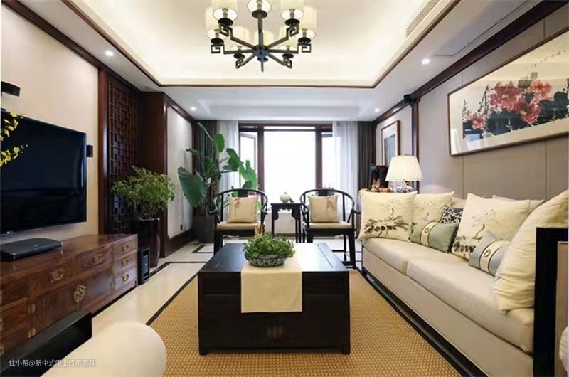 方正轮廓的客厅家具和规整的布局,塑造恢弘之势,加上对灯饰的细节处理,都体现出中式的人文思想。