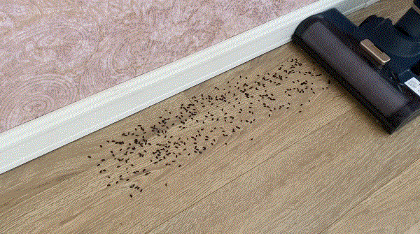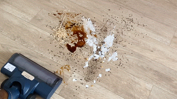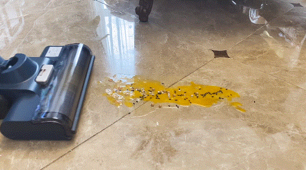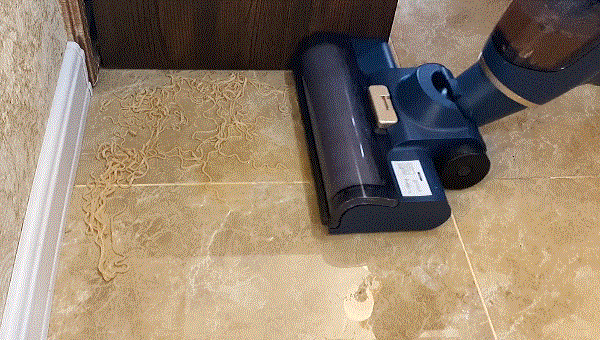 图中可以看到,面对紧贴墙角的面条和汤渍,洗地机一遍过,甚至不在滚刷扫过区域的面条,也被嗖的一下吸走了,处理的非常干净。