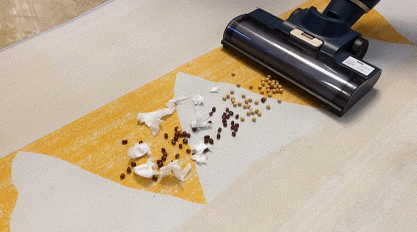 动图看下实际效果,有标准档和加强档两种模式,像这种洒在地毯上的豆子、纸屑等大颗粒固体物,用标准档轻轻松松的就清理干净了。而且因为这款洗地机可以自由控制出水,所以拖地毯完全不会湿漉漉,很赞!