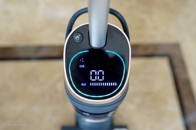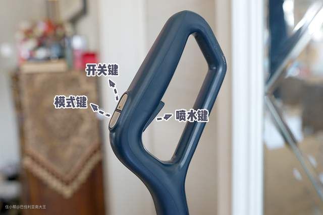 手柄前端是电源按键和模式切换按键,有标准/强力两个档位,轻松切换。手柄内测还有个喷水控制开关,可以自由控制出水,不喷水的时候就相当于在吸尘,适用于更多地面清洁需求。