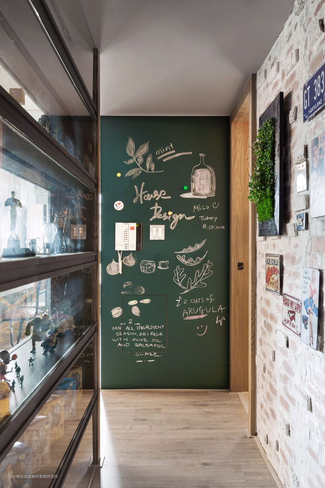 3、也有人另辟蹊径,把黑板墙作为背景板,然后装饰成照片墙,至于当留言板或者写菜谱或许以前流行,现在有了智能手机会更便捷,无论是聊天还是视频学做菜都更有效率。