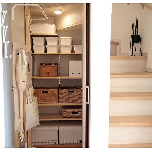 在楼梯下的空间放一个大小合适的置物架,可以放置一些日常不常用的工具,减少房间凌乱感▲
