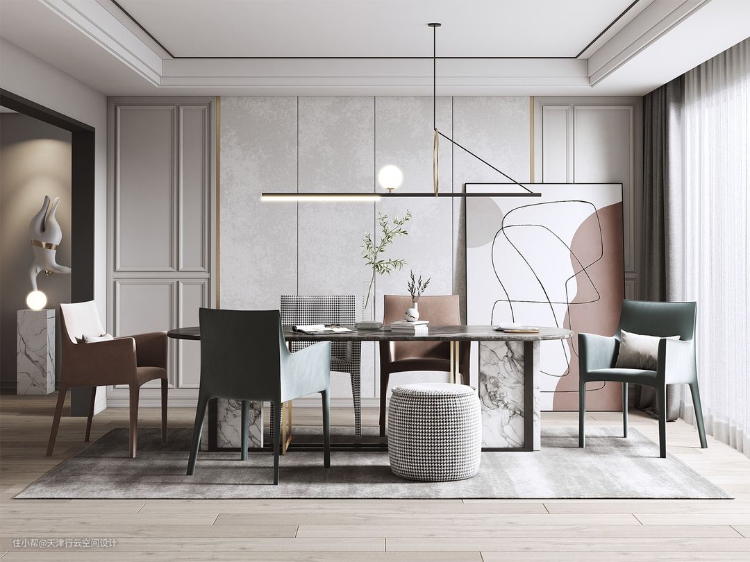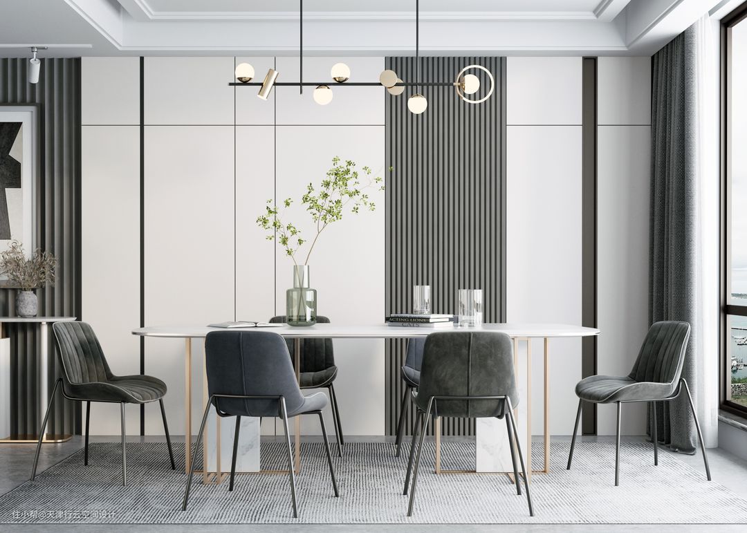 白色的吊顶搭配简单的吊灯,餐桌的背景墙造型也比较简单,色彩主要是白色和灰色,搭配白色的岩板餐桌和灰色的餐椅的搭配。