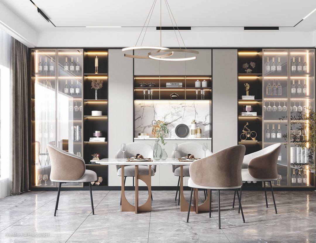 餐厅的背景墙做的事到顶的餐边柜,大大增加收纳方面的功能,好像博物馆里的展示柜,那些容易损坏又想和别人分享的饰品,可以摆放在这里,透过顶部的灯光装饰,更加凸显物品的珍去。