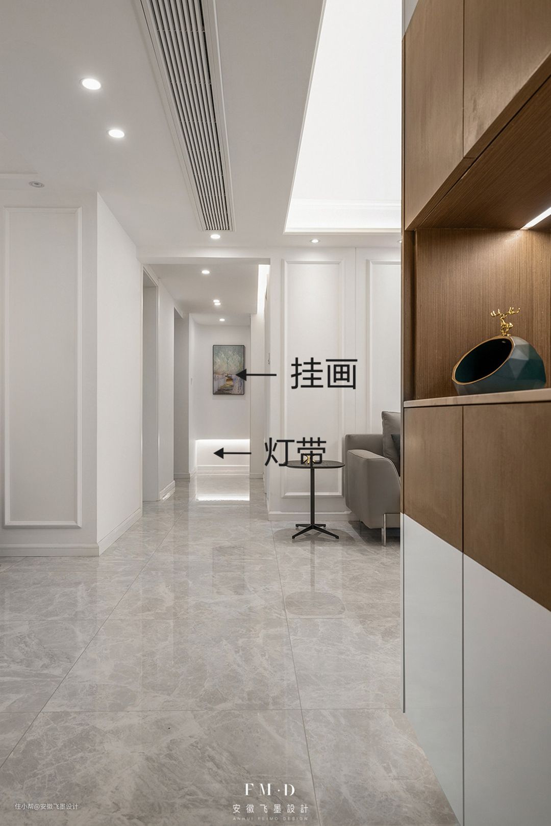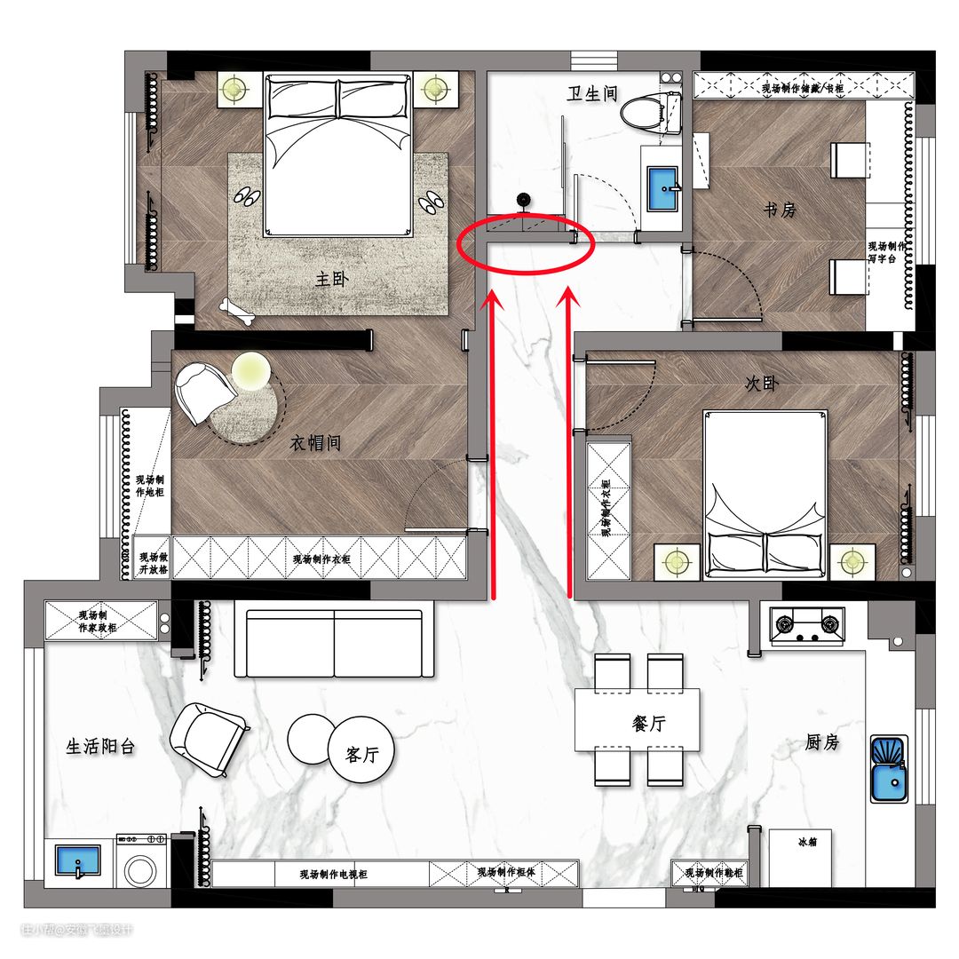 你家有没有这么一条过道?两边是房门,尽头是面墙,这该如何设计呢?其实我们可以把重点放在端景墙上,也就是画圈位置▼
