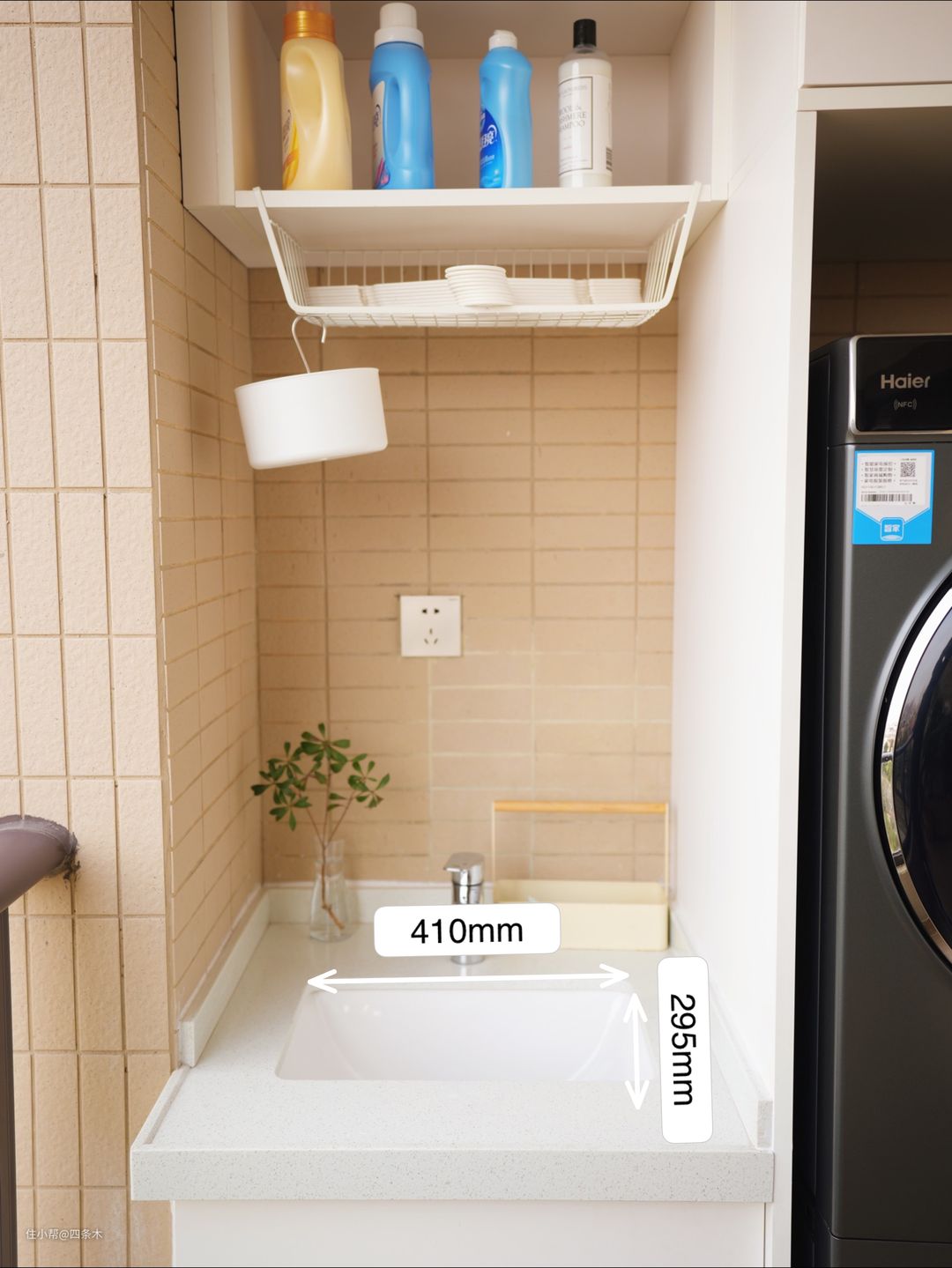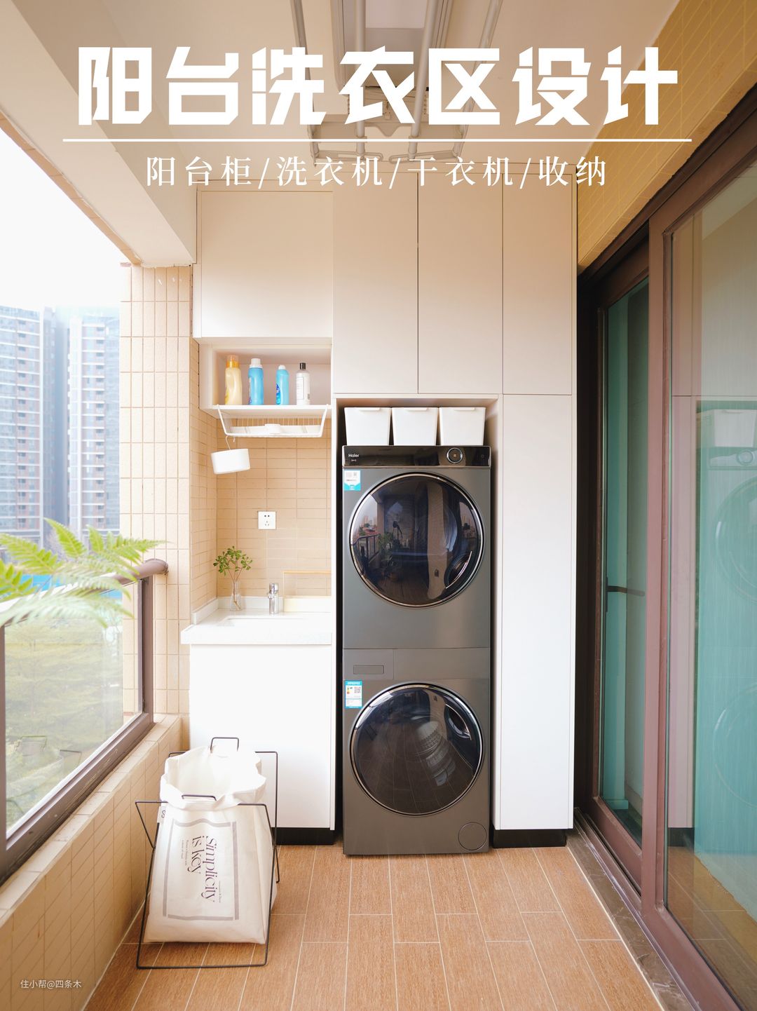 下面以我家为例,和大家聊聊我家阳台洗衣区是怎么布置的。