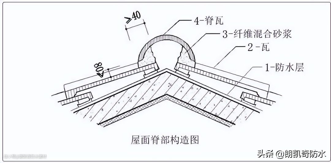 ④ 脊瓦与坡瓦面之间的缝隙用聚合物水泥防水砂浆找平压实,脊瓦下端距坡屋面的高度不宜超过80mm,脊瓦在两坡瓦面上的搭接宽度,两边不应小于40mm;