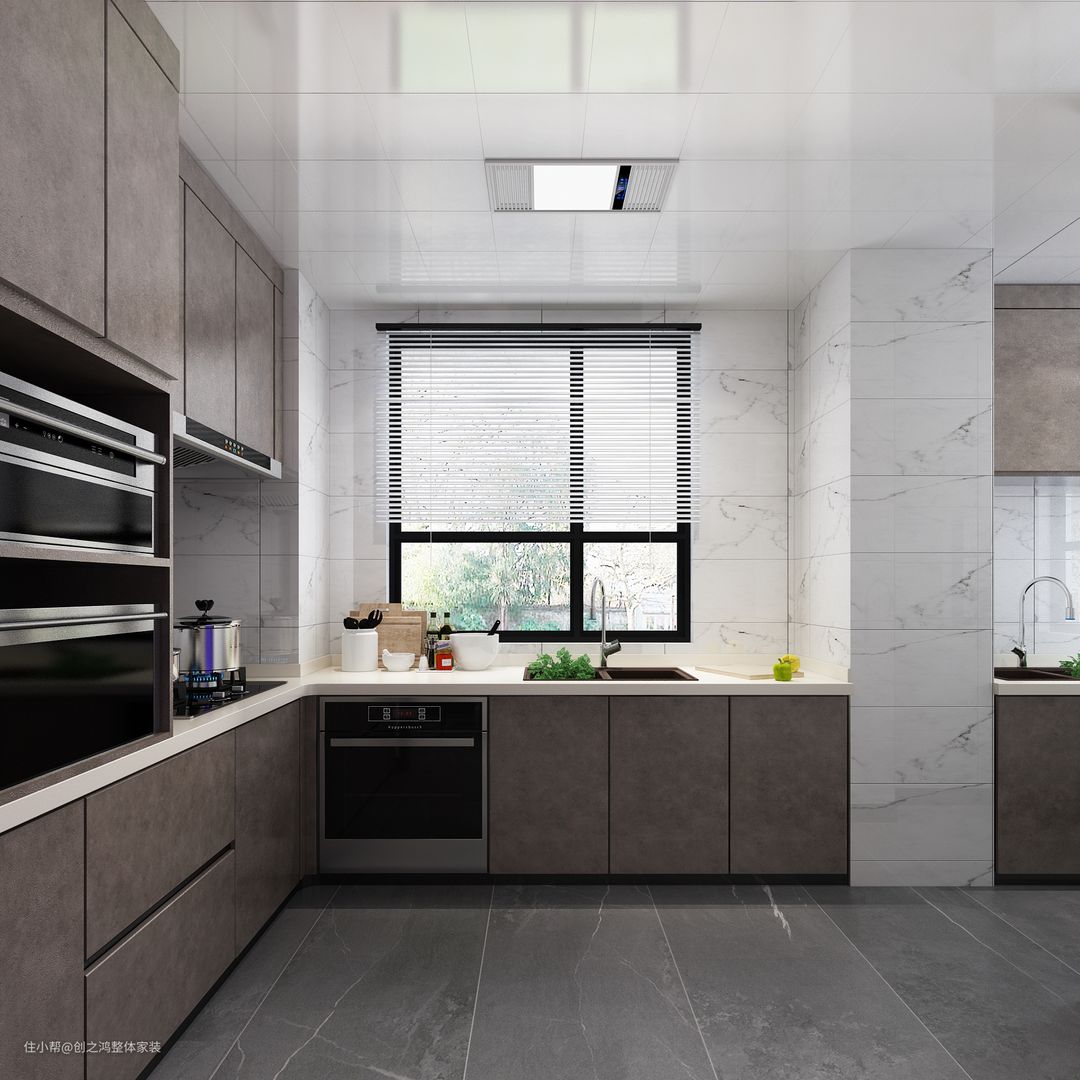 厨房气质沉稳,整体选择棕色调的搭配,全部家电做内嵌设计,整体性很棒;L型厨房做饭很顺手!而且还增加了橱柜储物空间;